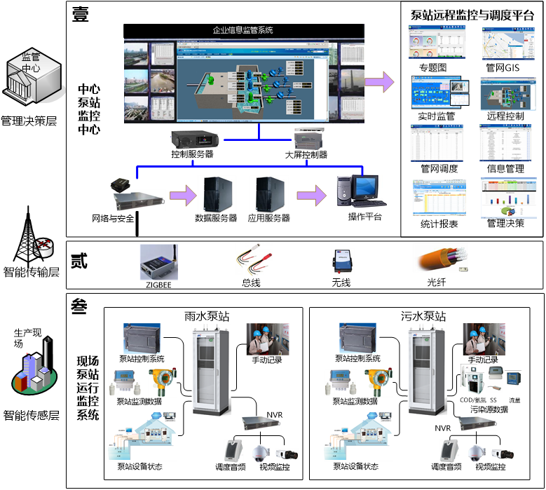 管網(wǎng)泵站遠(yuǎn)程監(jiān)控與調(diào)度系統(tǒng)是通過在現(xiàn)場雨水與污水泵站建立自動控制、設(shè)備狀態(tài)監(jiān)控、視頻監(jiān)控、調(diào)度音頻等方面的綜合運行監(jiān)控系統(tǒng),并與中心運行與調(diào)度平臺實時對接,實現(xiàn)泵站運行監(jiān)控、遠(yuǎn)程控制、綜合調(diào)度的等功能,為提高管網(wǎng)泵站運營管理效率,降低運行成本提供確實可行的科學(xué)手段。